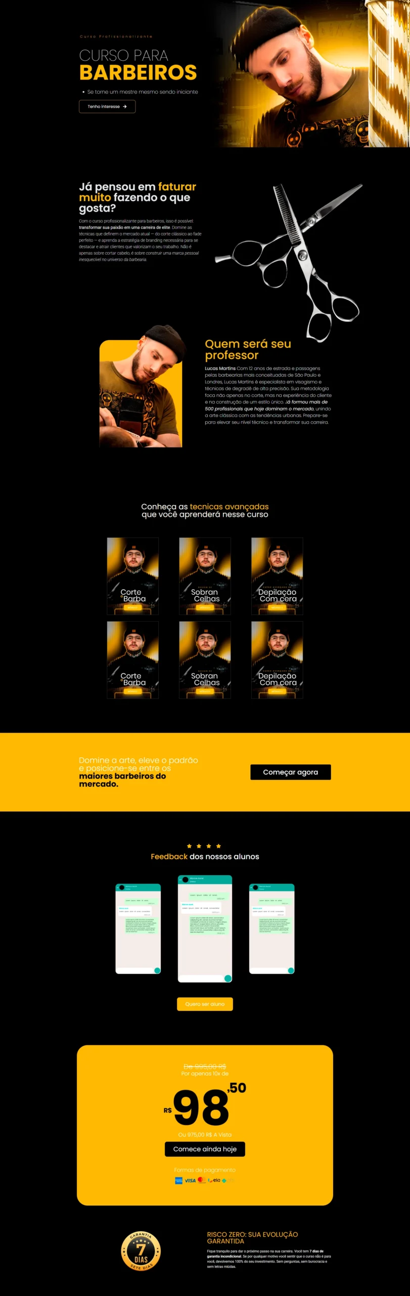 O Conceito Este projeto foi desenvolvido com um objetivo claro: transformar um curso de barbearia em uma experiência de luxo. No nicho de infoprodutos, a primeira impressão determina o valor percebido. Aqui, a direção de arte foi pautada na autoridade e na exclusividade, utilizando uma paleta Black & Gold para comunicar sofisticação imediata.